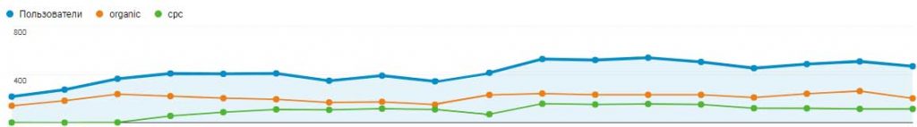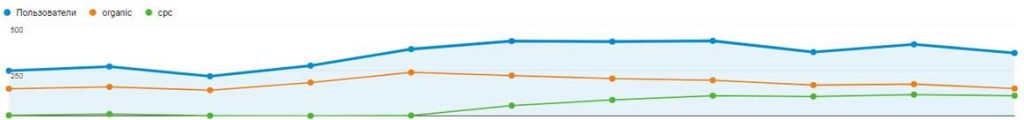 Синим цветом обозначены все посетители сайта, оранжевым — посетители из поисковой выдачи, зелёным — посетители из контекстной рекламы